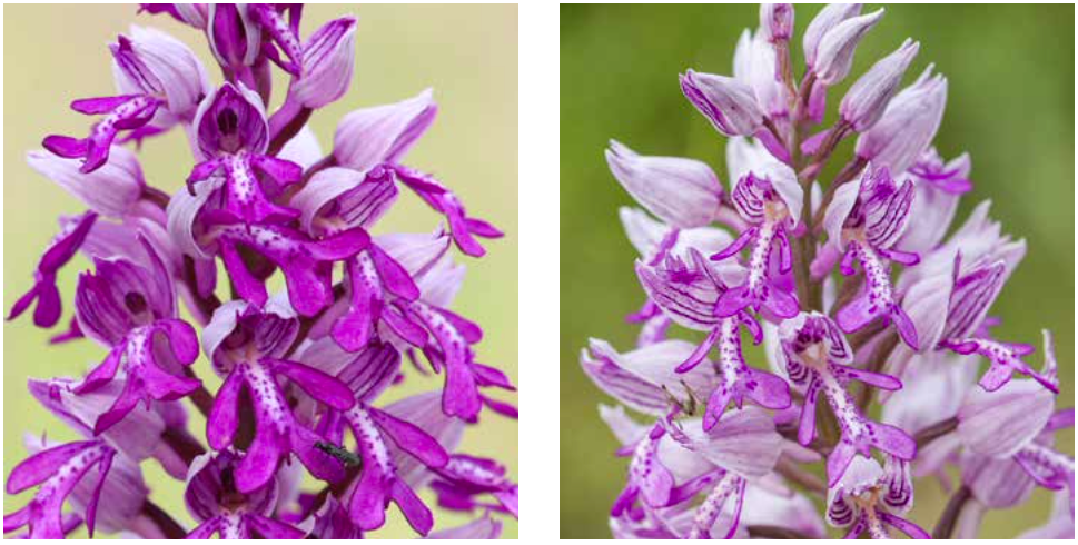 Ein aus den oberen Blütenblättern geschlossener „Schutzhelm“ für Pollinien und Narbe ist typisch – nicht nur für das Helm-Knabenkraut (Farbvarianten).