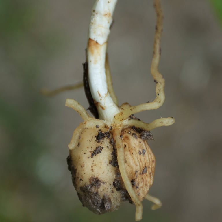 Abb. 3 + 4: Nach der Landung dringen Pilzfäden (Hyphen) in den Samen ein und dieser beginnt durch deren Nährstoffversorgung zur Orchideenpflanze heranzuwachsen.