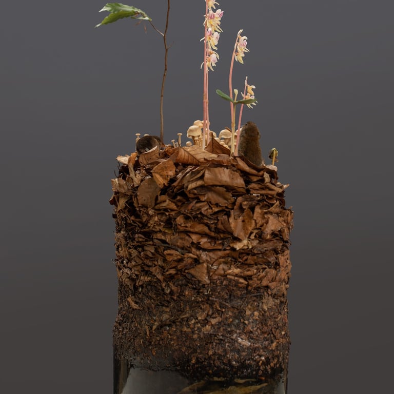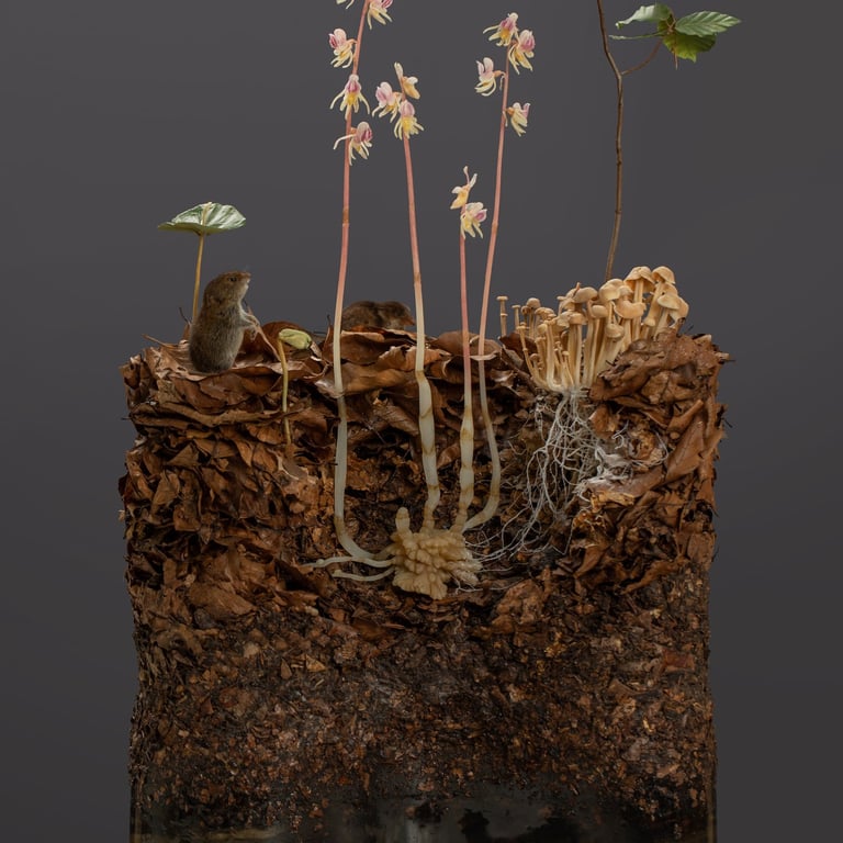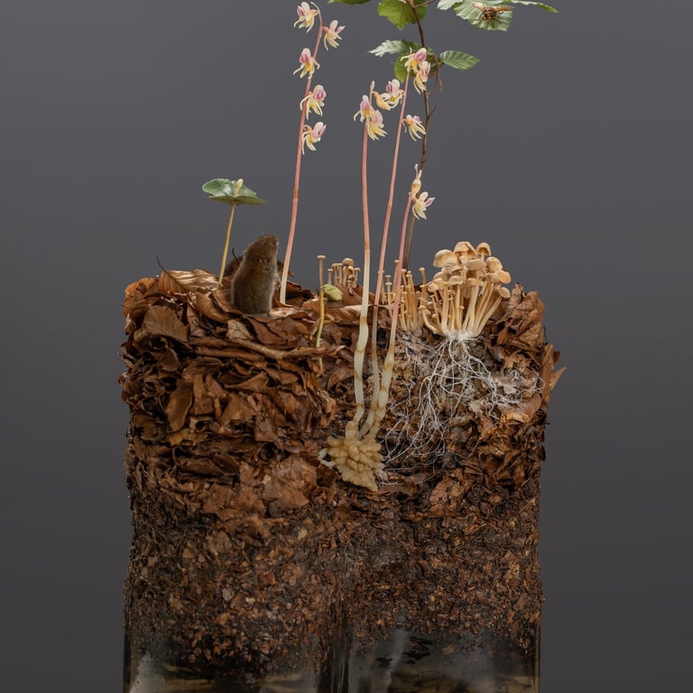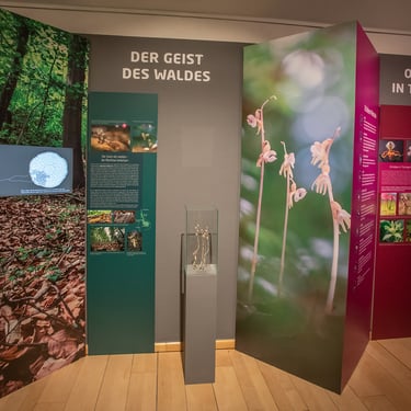 Habitat-Displays mit naturidentischen Pflanzen- und Pilzmodellen.
