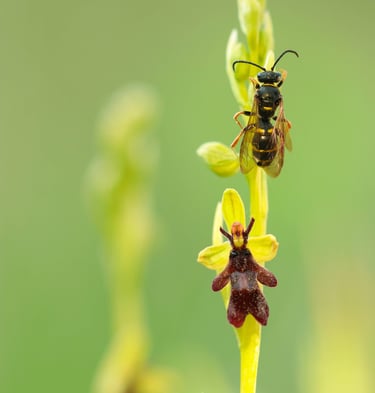 Fliegen-Ragwurz (Ophrys insectifera) mit Bestäuber, copyright© S. Brandt