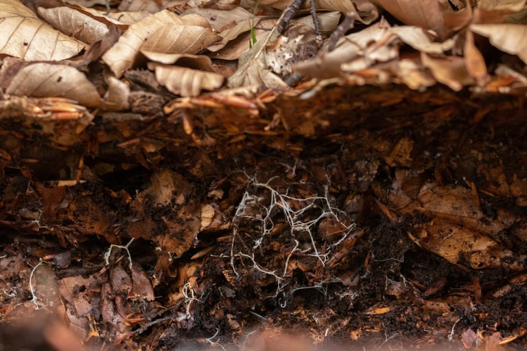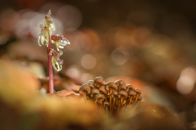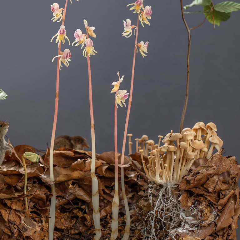 mykoheterotrophe Beziehung Widerbart (Epipogium aphyllum) mit Büschelrübling (Gymnopus confluens) und Rotbuche (Fagus sylvatica)