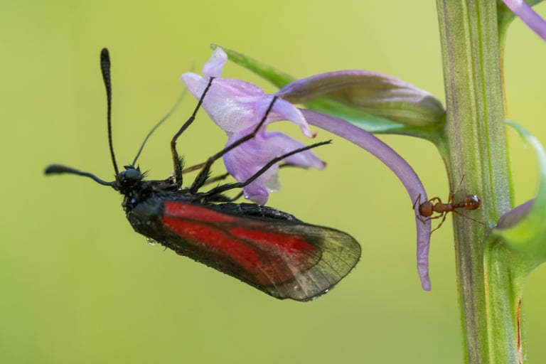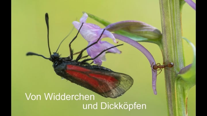 professionelle Naturfotografie von Händelwurz und Bibernell-Widderchen (Zygaena purpuralis), inklusive Nutzungsrechte