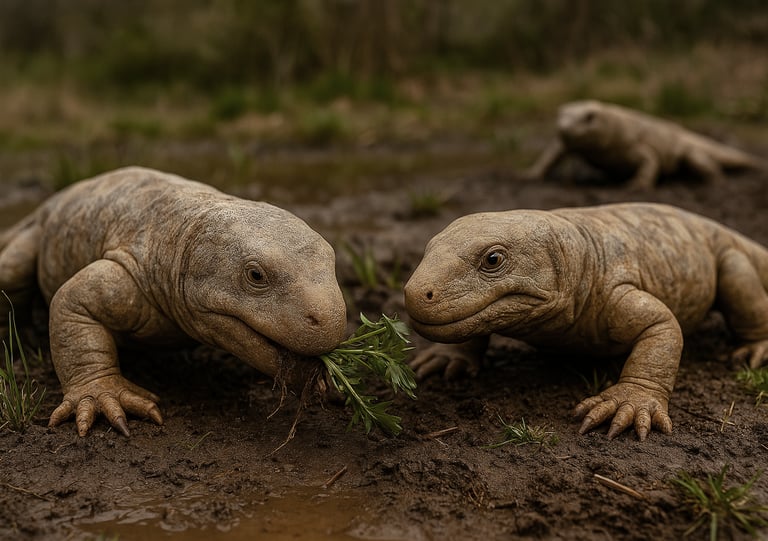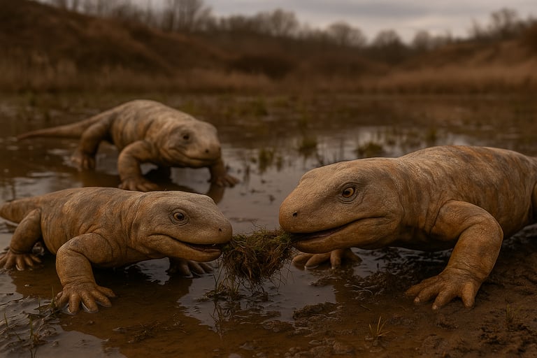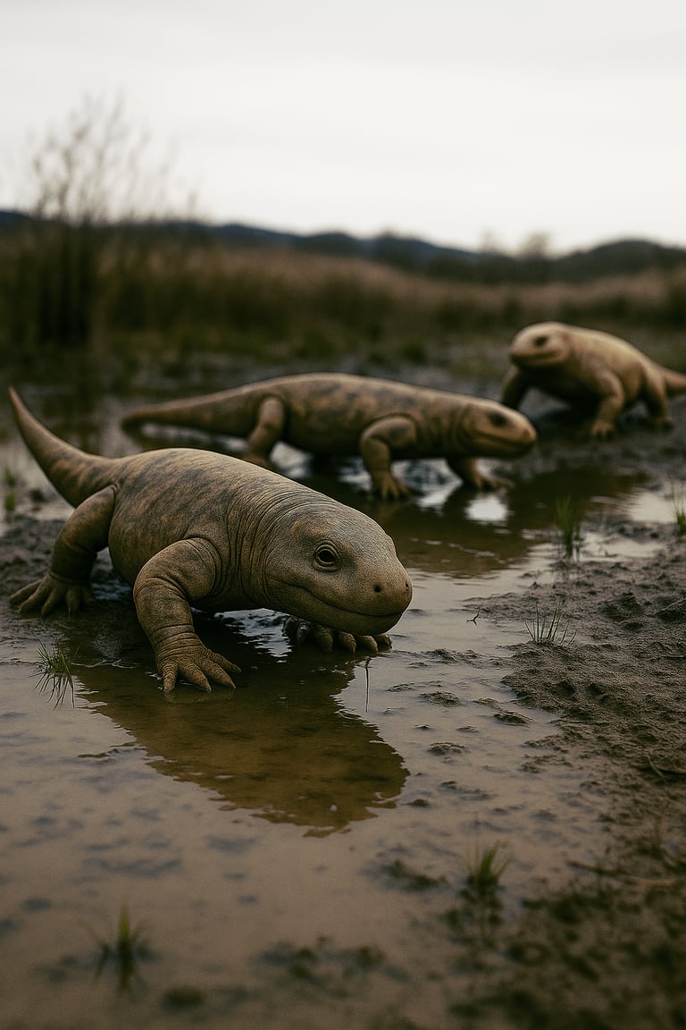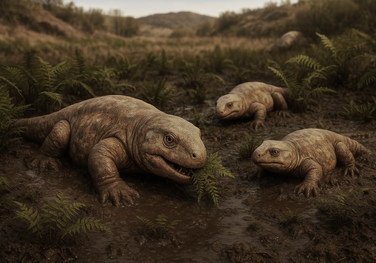 Saisonale Monsun-Gewitter überschwemmten die trockenen Ebenen und Canyons mit schweren Fluten aus Ton- und Sandablagerungen. An den Ufern kleiner Bäche und saisonaler Teiche bildete Pioniervegetation grüne Oasen des Lebens, die Heimat der ersten echten landlebenden Wirbeltiere wie Orobates, Seymouria, Martensius und andere. Die meisten von ihnen waren Allesfresser, aber im Fall von Diadectes auch die ersten echten Pflanzenfresser. Die Überschwemmungen brachten auch eine Menge fleischiger Nahrung in diese Ökosysteme, wie Aas von ertrunkenen Tieren. Solche Tiere und deren Kadaver waren wahrscheinlich [...]