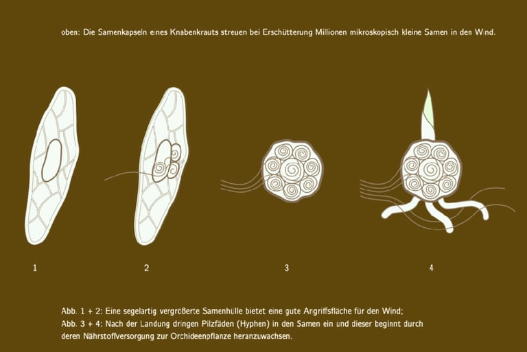 Orchideen bilden mikroskopisch kleine Samen aus. Deshalb passen Tausende von ihnen in eine einzige Fruchtkapsel beispielsweise eines Knabenkrautes. Nach der Reife platzen immerhin bis zu 100 von diesen am vertrockneten Blütenstand auf und durch den Wind bewegt funktioniert dieser wie ein Gewürzstreuer des Lebens für Millionen möglicher Nachkommen. Durch den Wind werden sie teilweise über viele Kilometer davongetragen – doch nur ganz Wenige wehen in einen passenden Lebensraum.