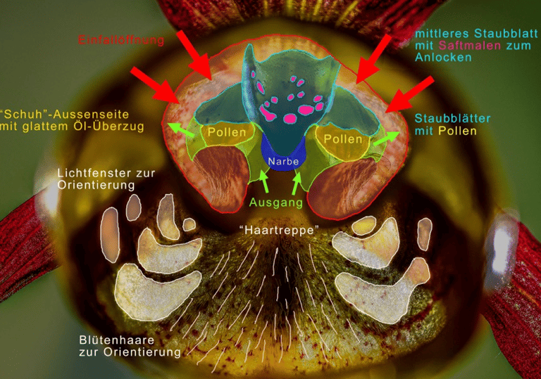 Die elegante Blüte des Frauenschuhs (Cypripedium calceolus) ist ein komplexes Fortpflanzungs-Organ. Wie bei allen Orchideen sind die weibliche Narbe und die auf zwei reduzierten Staubgefäße (Pollinien) zu einer sogenannten Säule verwachsen die hier hinter einem rotbraun-getupften Staubblatt verborgen ist. Die Blütenlippe ist nach innen umgekrempelt und zum markanten gelben Schuh aufgebläht. Dieser ist außen ölig glatt und hat nur eine enge fallgrubenartige Öffnung oben. Das Innere ist rötlich gefleckt und mit dichten langen Haaren überzogen, die nach hinten hinauf zur Säule weisen.