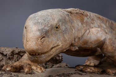 This Permian landscape, far removed from the sea, was characterized by an extreme continental climate with scorching days and cool nights. It was the era of the single supercontinent Pangaea, before it began to break apart and split into today’s continents. Evidence also confirms periodic temperatures below freezing, forcing the flora and fauna to adapt to significant climatic extremes in order to survive. The herpetofaunal vertebrates of this period are referred to as 'Ursaurier'—not because they are close ancestors or relatives of the dinosaurs that appeared millions of years later, but because they represent the first clearly documented, fully terrestrial vertebrates in the evolution of life.