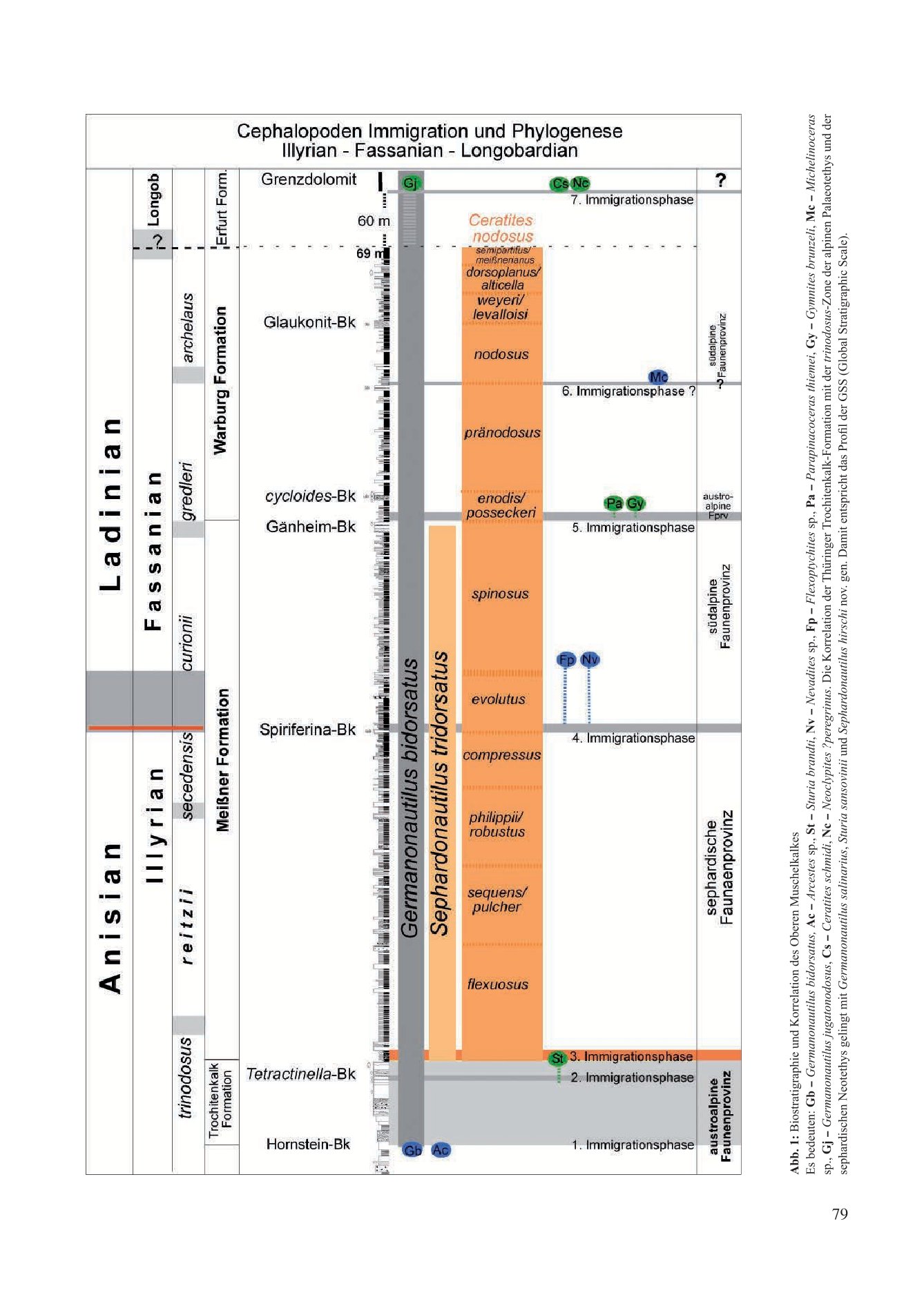 The first immigration phase into the newly emerging habitat of the Upper Muschelkalk occurred at the base of the Illyrian within the lower trinodosus zone. The immigrated Nautilus salinarius and Arcestes sp. from the Austroalpine-Dinaric faunal province enable the first chronostratigraphic and biostratigraphic correlation with the Palaeotethys. Descriptively, the ancestral species Nautilus salinarius Mojsisovics, 1882 gave rise to the new species Nautilus bidorsatus Schlotheim, 1820. Both species were united by Mojsisovics (1902) within the newly defined genus Germanonautilus, with Germanonautilus bidorsatus designated as the type species.