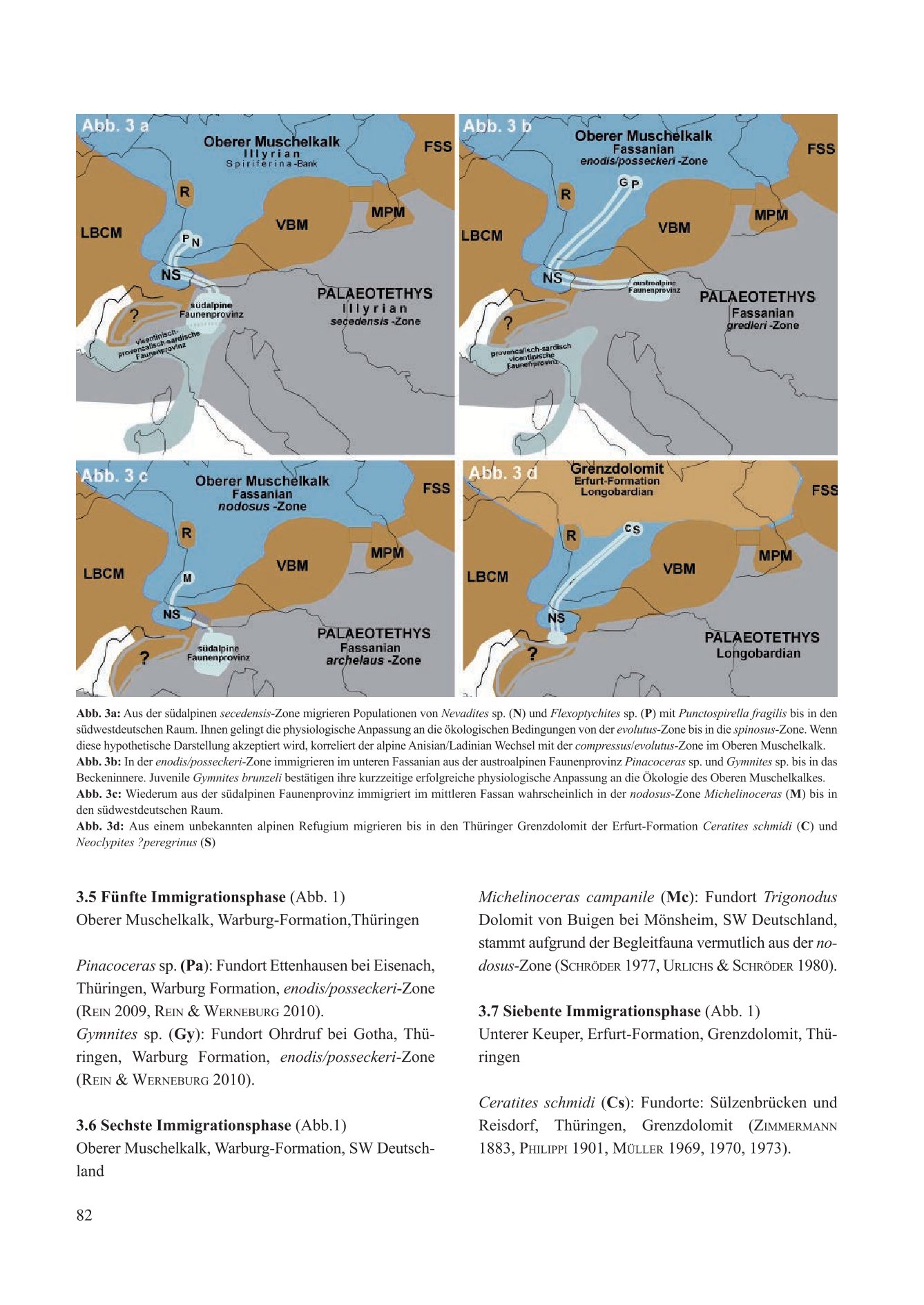 Variant 2: If the Southern Alpine ammonites immigrated concurrently with the brachiopod Punctospirella fragilis, post-mortem transport of individual shells would be ruled out. The timing of the fourth immigration phase would chronostratigraphically and biostratigraphically correspond to a successful immigration attempt of entire populations at the Anisian/Ladinian transition. Following territorial and reproductive isolation, the immigrated ammonites developed into distinct cladogenetic species up into the spinosus zone. The conservative Flexoptychites remained without, and Protrachyceras with unknown morphological injury on the venter, based on which Spath (1934) removed the specimen from the genus Ceratites de Haan 1825 and unjustifiably placed it in its own genus Alloceratites (an injury does not justify a taxonomic change).