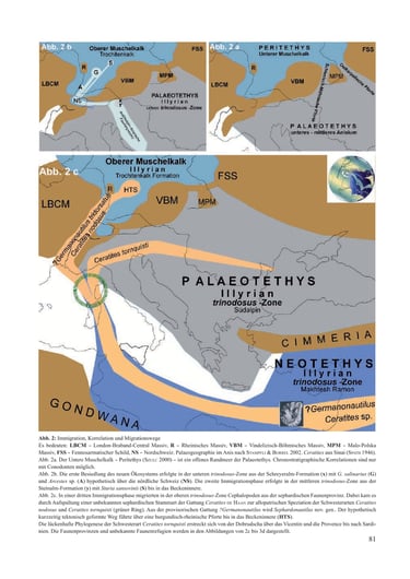 As a newly emerged ecosystem, the Upper Muschelkalk represents a tectonically dominated epicontinental sea characterized by its constantly changing marine connections to various faunal provinces of the Palaeotethys and Neotethys. Immigrated macrofossils enable biostratigraphic and chronostratigraphic correlation as well as the reconstruction of hypothetical migration routes into the inland sea, chronologically marked by Germanonautilus bidorsatus and Sephardonautilus tridorsatus and their respective hypothetical gateways.