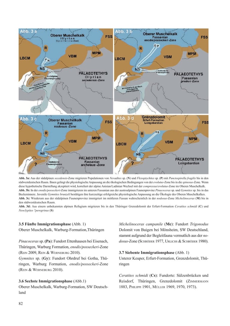 Populations of the Southern Alpine morphs Flexoptychites angusto-umbilicatus and Protrachyceras recubariense hypothetically immigrated concurrently with the brachiopod Punctospirella fragilis. The timing of this fourth immigration phase corresponded chronostratigraphically and biostratigraphically to the Anisian/Ladinian transition. Through physiological adaptation, Flexoptychites and Protrachyceras survived in SW Germany from the evolutus zone into the spinosus zone. They await a new cladogenetic species status.
