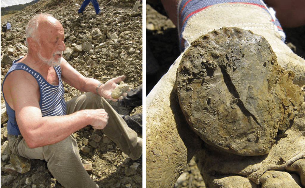 I couldn’t let it go, and we spent many days searching the slopes—until June 24th, as dusk was already falling, it finally happened: a Ceratites flexuosus peeked out of the slope in situ, 4.5 m above the Tetractinella bed. I started digging, and within about 30 minutes, I had recovered no less than 16 almost perfectly preserved internal molds. Euphoric, I called my friend Siegfried Rein to report the sensation, as a Ceratite population had never been recovered from this horizon before. He set off immediately, and we continued digging well into the night by the light of our torches.