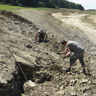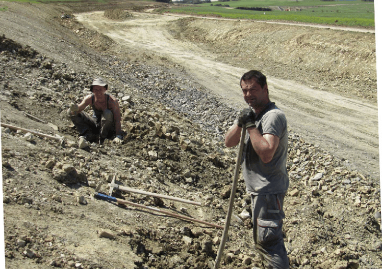 In the following days, everything had to move quickly: securing the site, absolute secrecy, informing the Erfurt Natural History Museum, and contacting DEGES as well as the executing construction company, Bickhardt Bau. Everything went smoothly, thanks in particular to Kay-Uwe’s excellent contacts. Subsequently, we organized a total of three major, adventurous excavations (at times in over 30-degree heat) involving heavy machinery and personnel from Bickhardt Bau, who even went so far as to re-excavate the already finished embankment slope specifically for us.